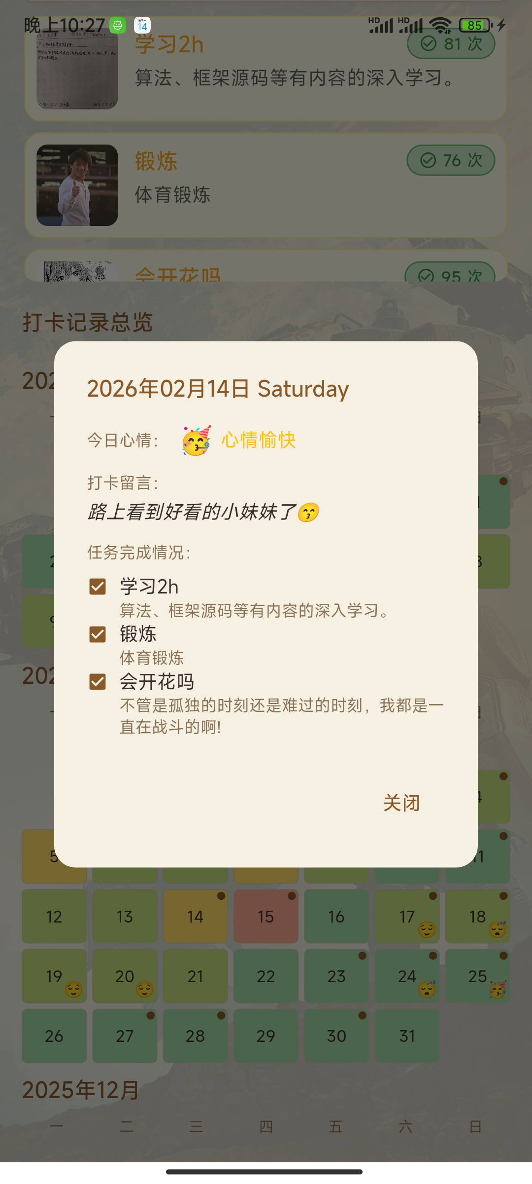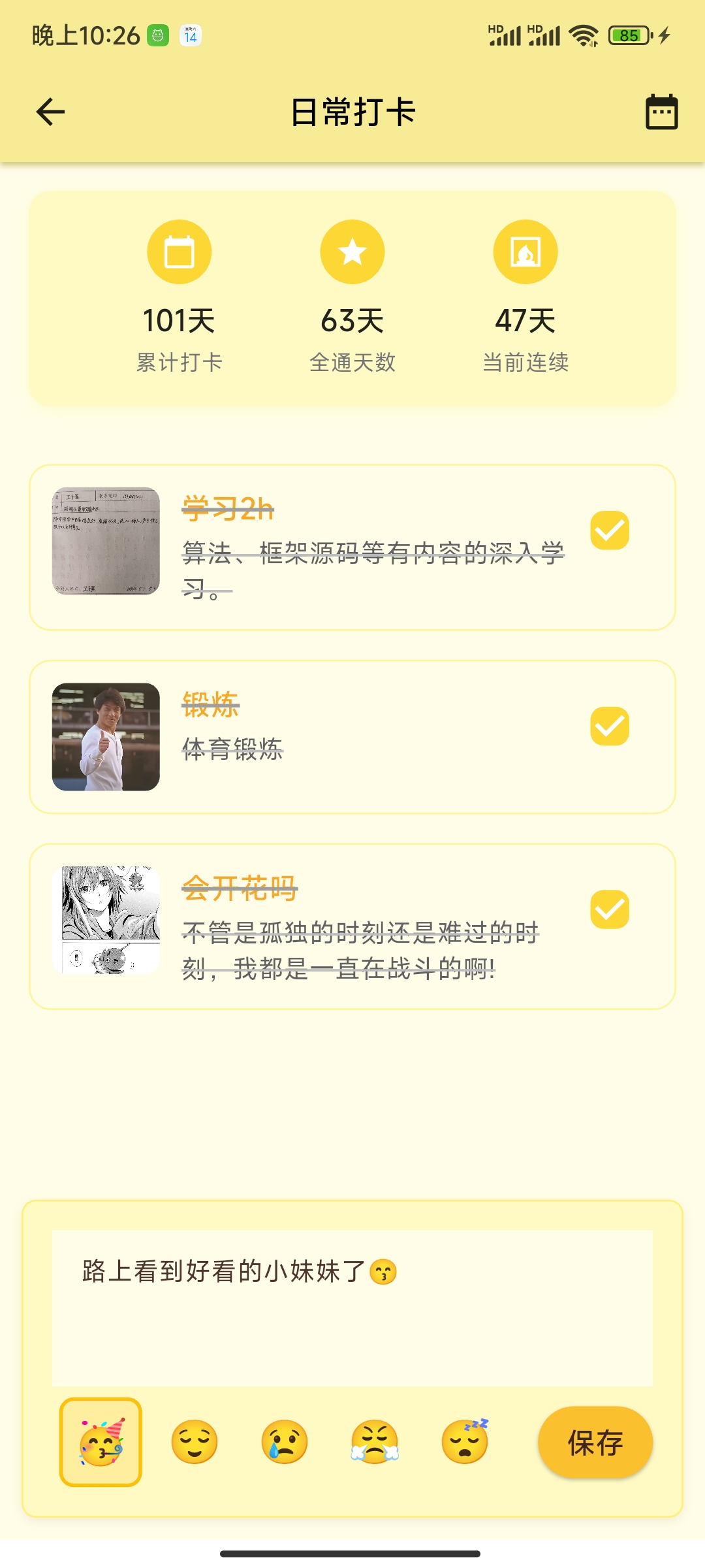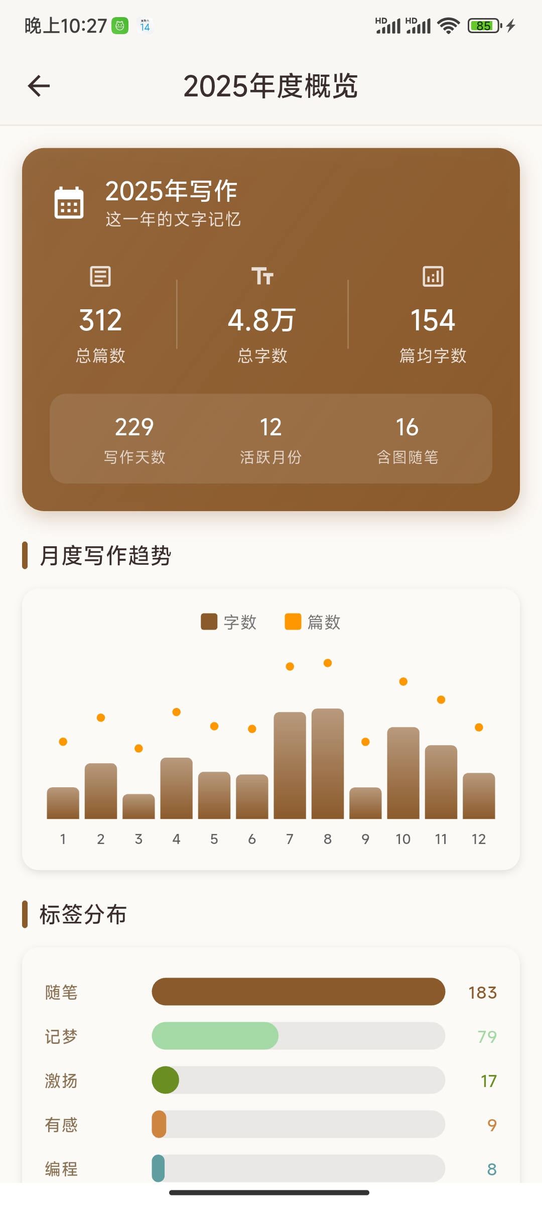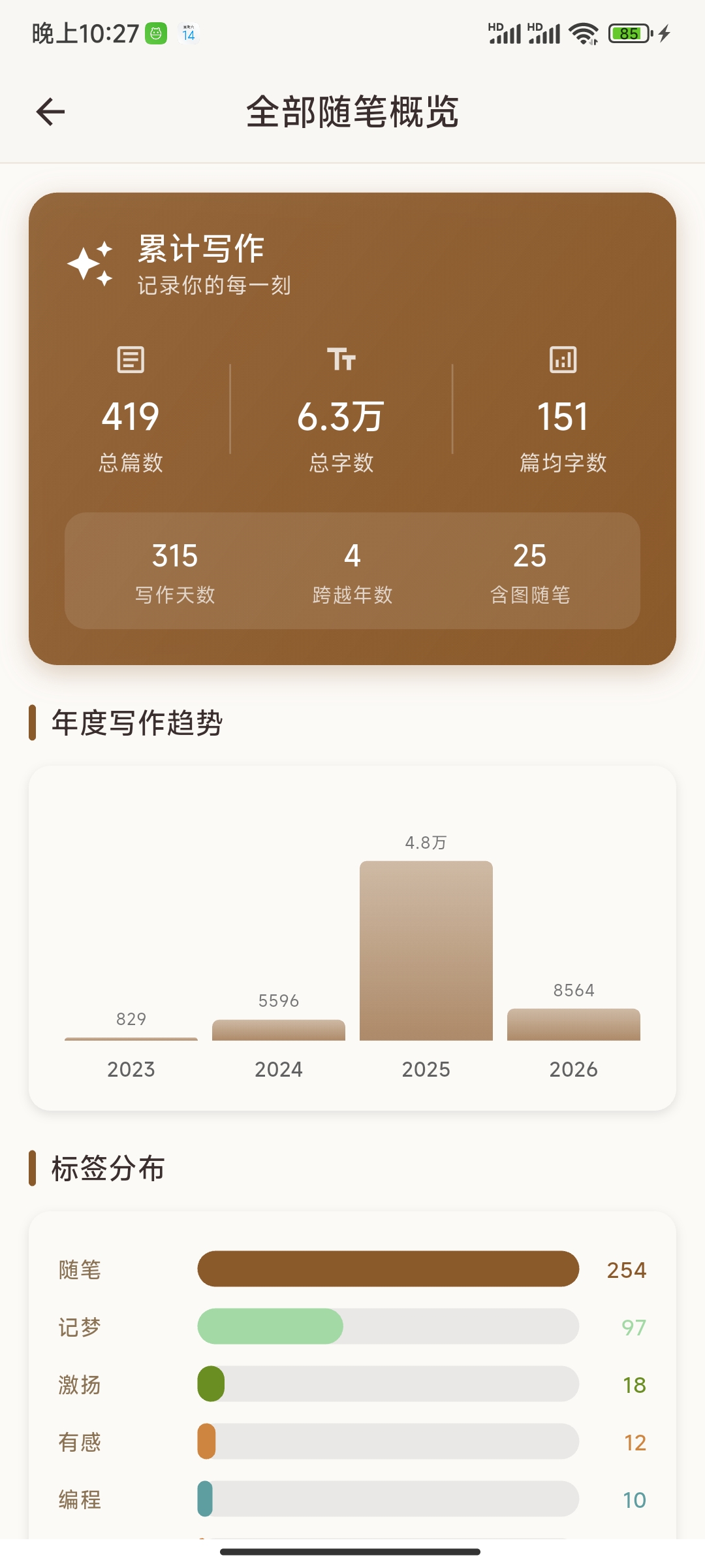 本应用是出于自用+练手目的制作的, 目标场景以我的需求出发. 比如我喜欢做任务一样地每天做点事然后回顾的时候有成就感, 于是有了积微页来打卡. 喜欢每天记点东西就有了随笔页写东西.