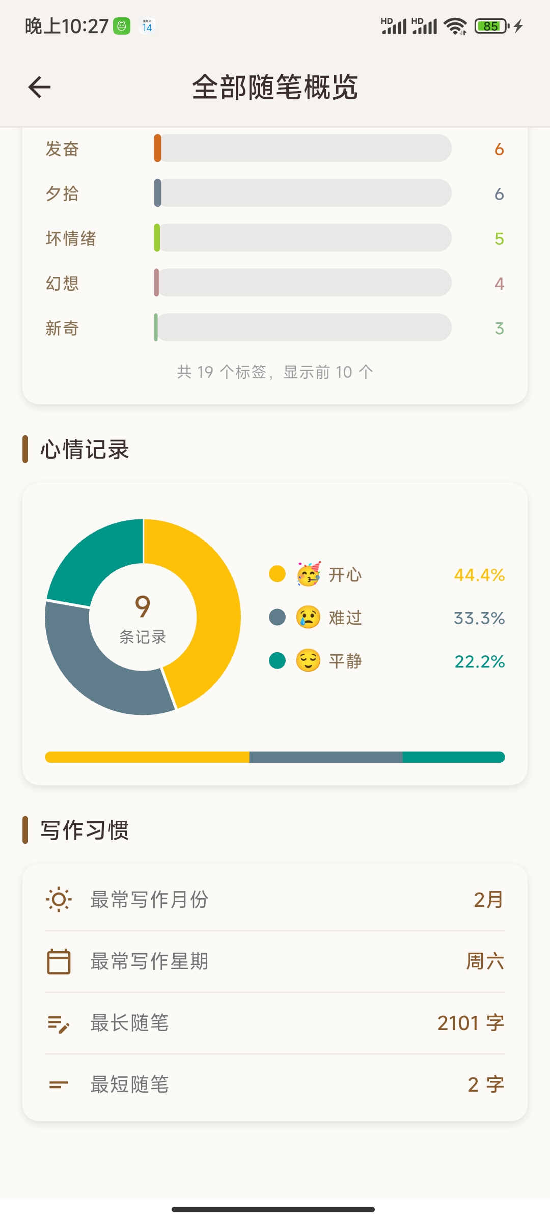 写日记、记录回忆、一天的经历等, 并打上标签, 可追加留言.