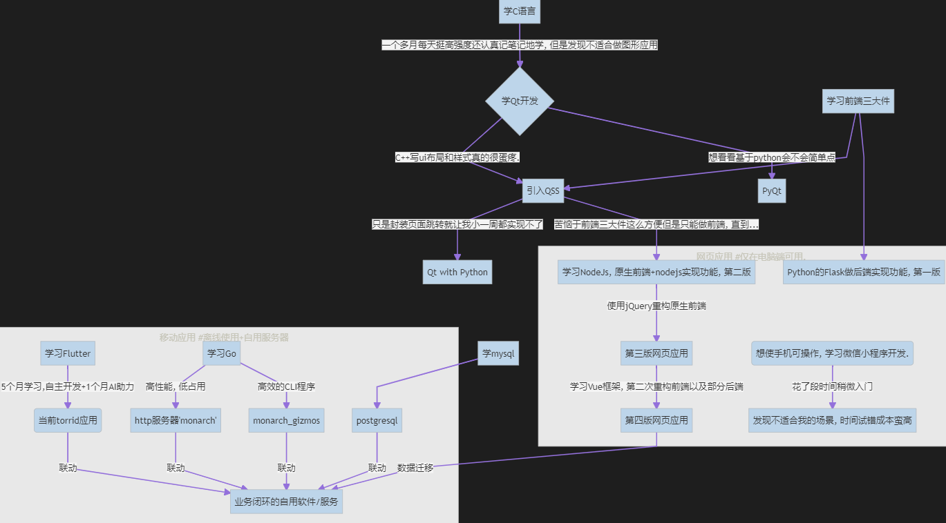 以往我学编程技术都是在哔站跟着视频一期一期从入门->上手->学api->实战->实际开发走这个流程, 这样子学效率暂且不说, 最挫败学习热情是最主要的. 我就以我试图开发一个"记录每日完成设定任务的工具"这一几乎在不能更简单的想法的实现过程开始现身说法吧, 下面是我痛苦又成效甚微的路线: